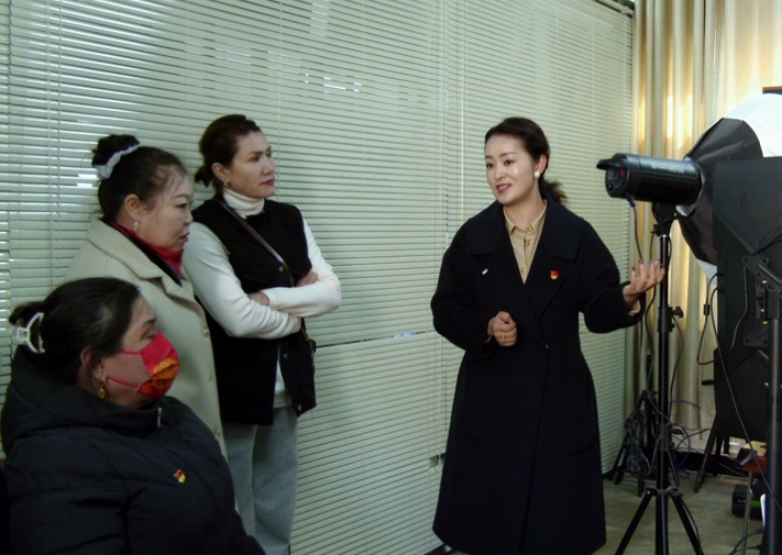 电子商务协会党支部书记郭玉梅正在向妇女们讲解直播间的布置情况、现场注意事项 鲁海霞