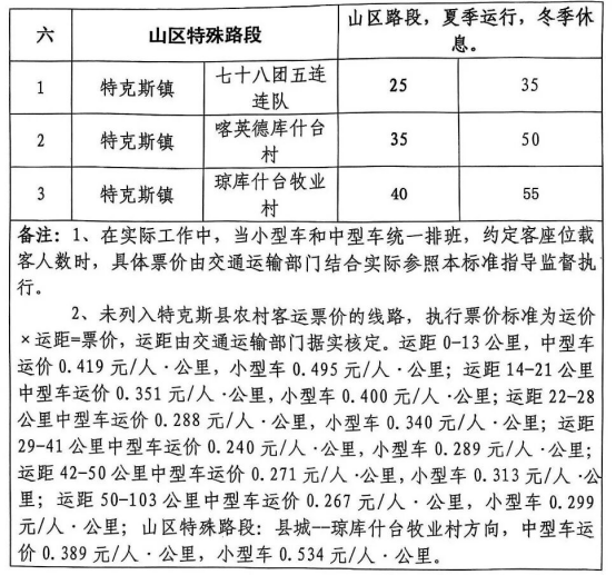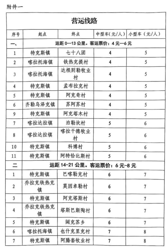 一、特克斯县县城至各乡镇村队票价详见附件。