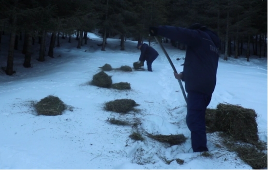 △巡护队员们给森林里的野生动物送去草料 段悦摄