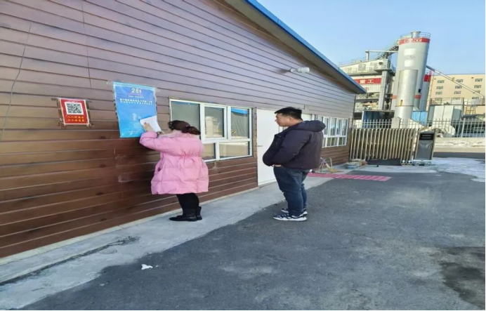 △检查组工作人员正在张贴安全生产相关宣传海报