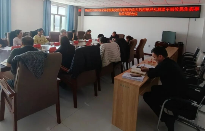 3月9日,县民政局召开特克斯县2026年深化养老服务突出问题整治和纠治困难群众救助不到位民生实事动员部署会议,深入学习贯彻习近平总书记近期重要讲话重要指示重要文章精神以及自治区、自治州相关会议精神,研究部署当前重点工作。