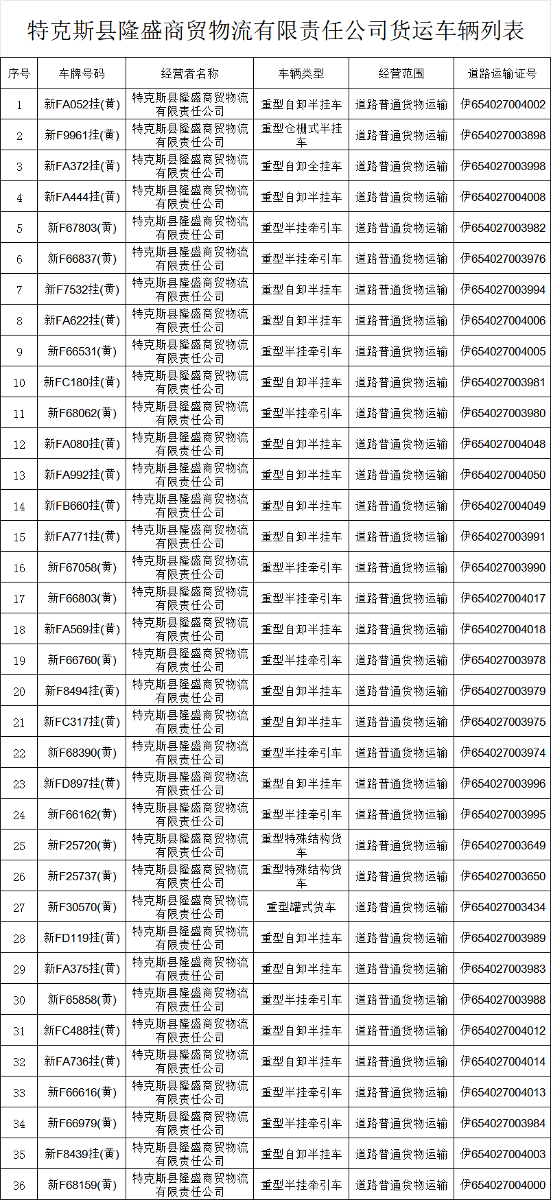 2.特克斯县隆盛商贸物流有限责任公司货运车辆列表