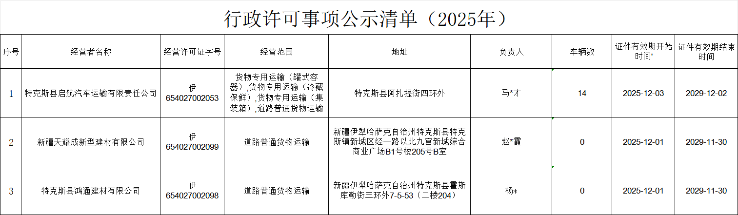 另根据《中华人民共和国道路运输条例》及《新疆维吾尔自治区道路运输条例》等相关规定,现就道路货物运输经营相关事项一并通告如下:准予特克斯县启航汽车运输有限责任公司增加集装箱运输、冷藏保鲜运输及罐式容器运输等专项运输能力;准予特克斯县鸿通建材有限公司、新疆天耀成新型建材有限公司经营道路货物运输;注销特克斯县隆盛商贸物流有限责任公司道路货物运输经营许可及相关道路运输证等事项,面向社会公示,并接受社会监督。