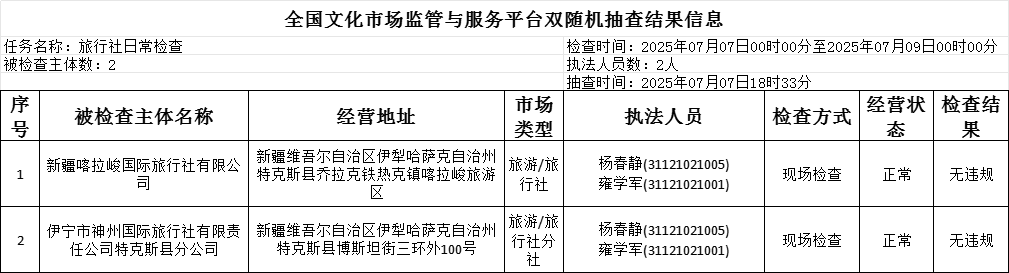 全国文化市场监管与服务平台双随机抽查结果信息(旅游相关随机抽查事项结果信息)