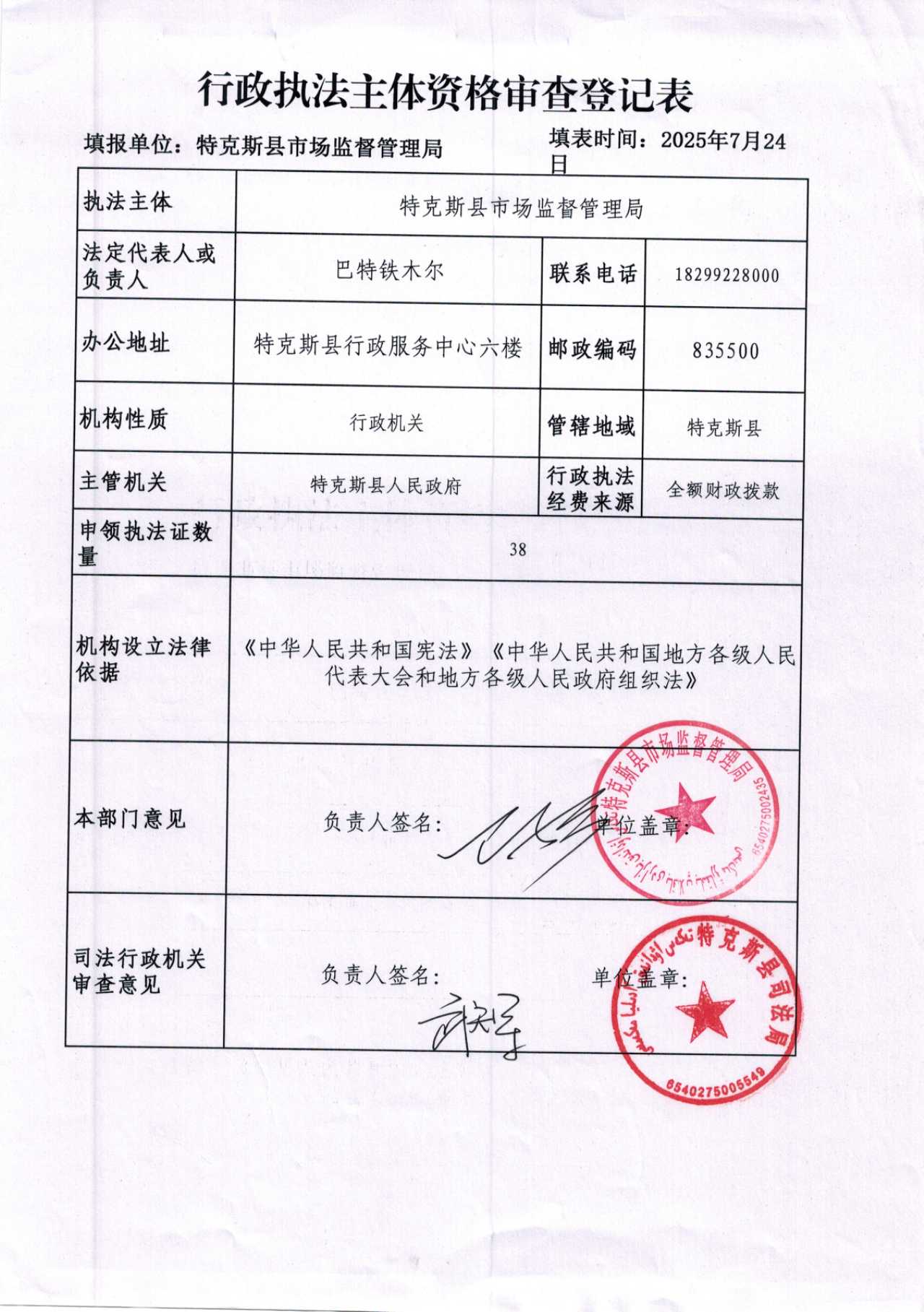 特克斯县市场监督管理局行政执法主体资格审查登记表