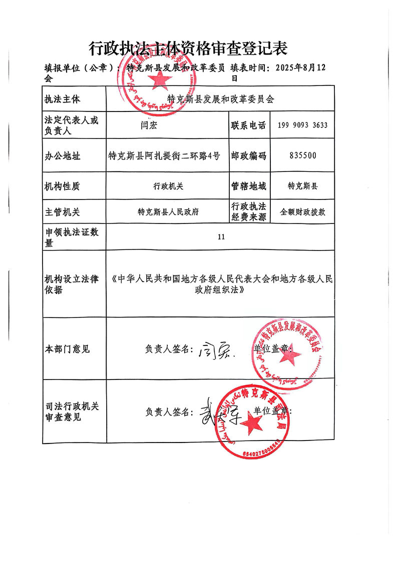 特克斯县发展和改革委员会行政执法主体资格审查登记表