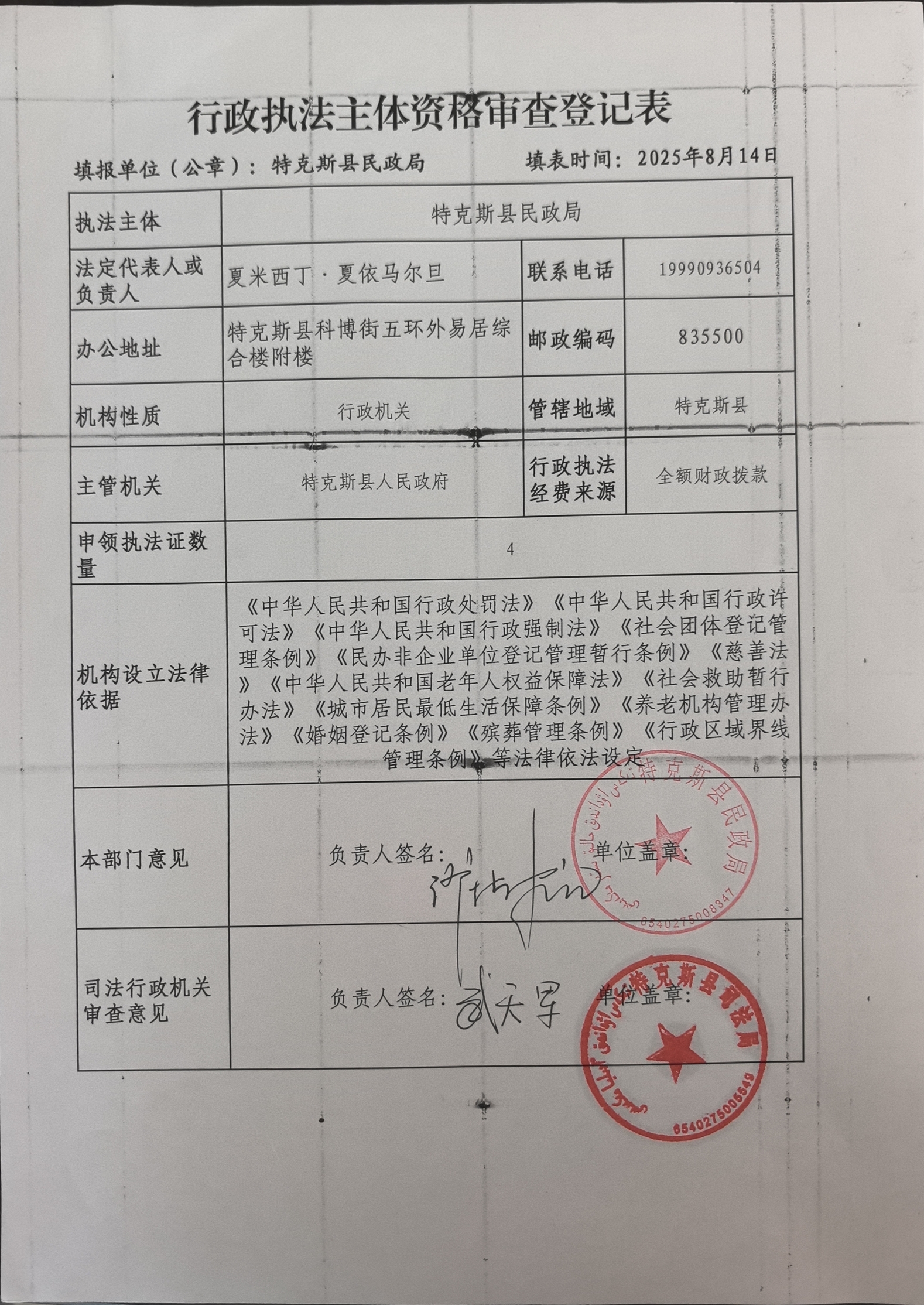 特克斯县市场监督管理局行政执法主体资格审查登记表