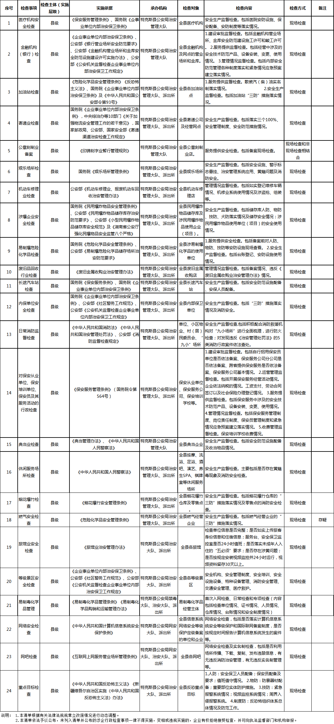 特克斯县公安局涉企行政检查事项清单