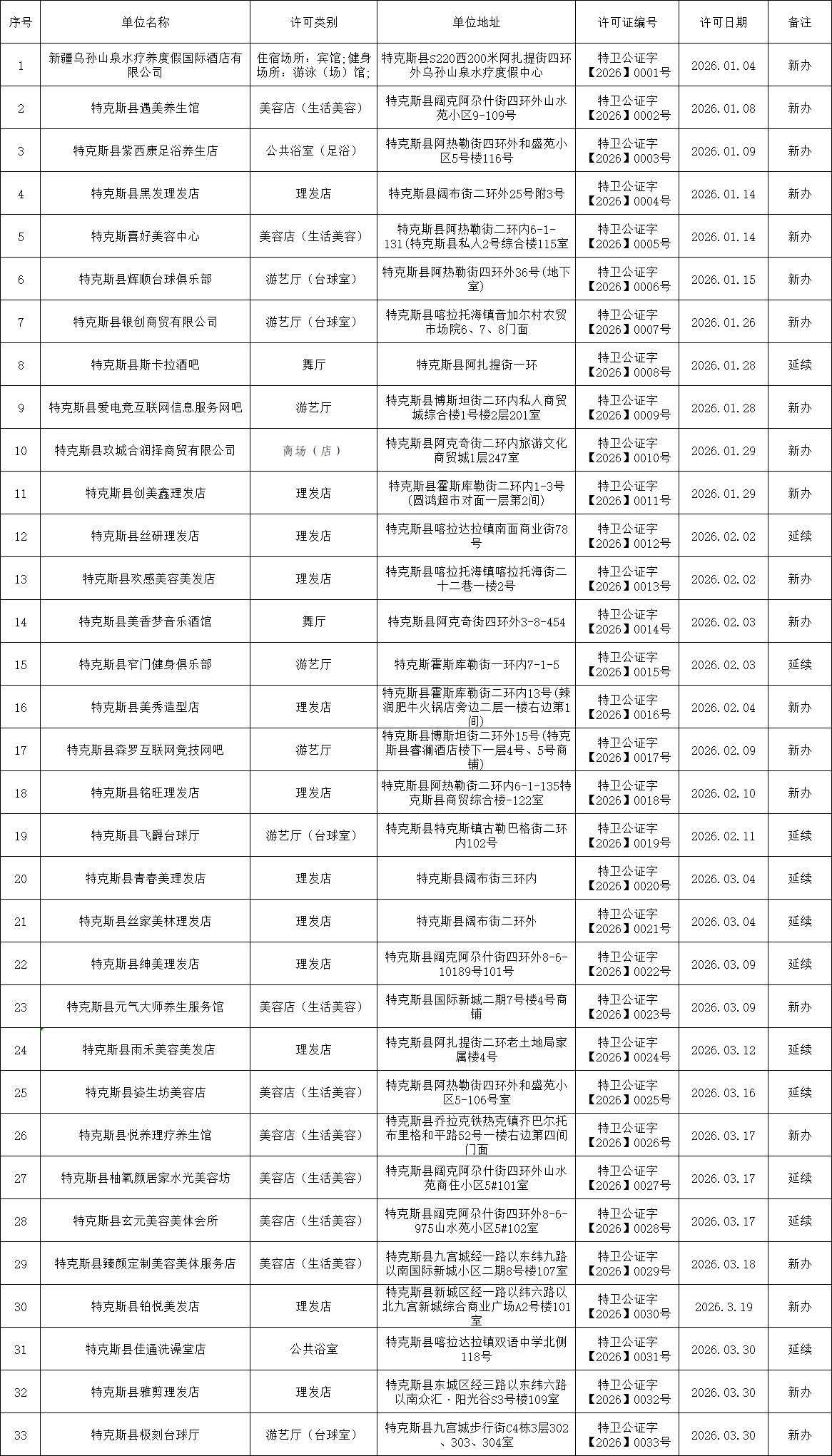 特克斯县卫健委2026年第一季度公共场所行政许可证登记表