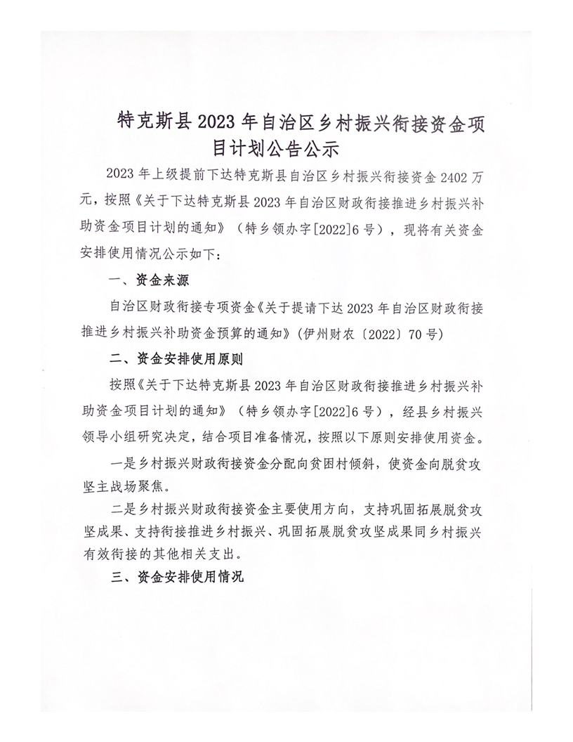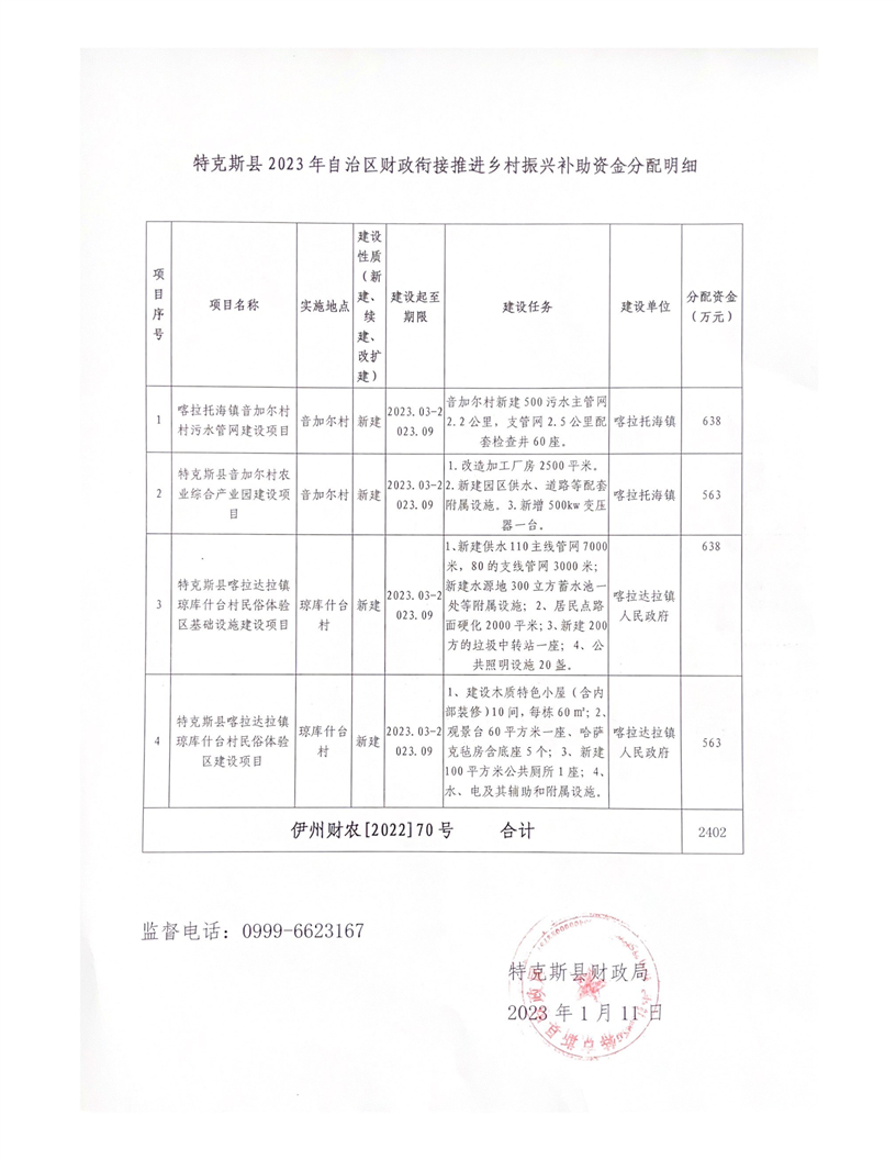 特克斯县2023年自治区乡村振兴衔接资金项目计划公告公示(伊州财农【2022】70号)