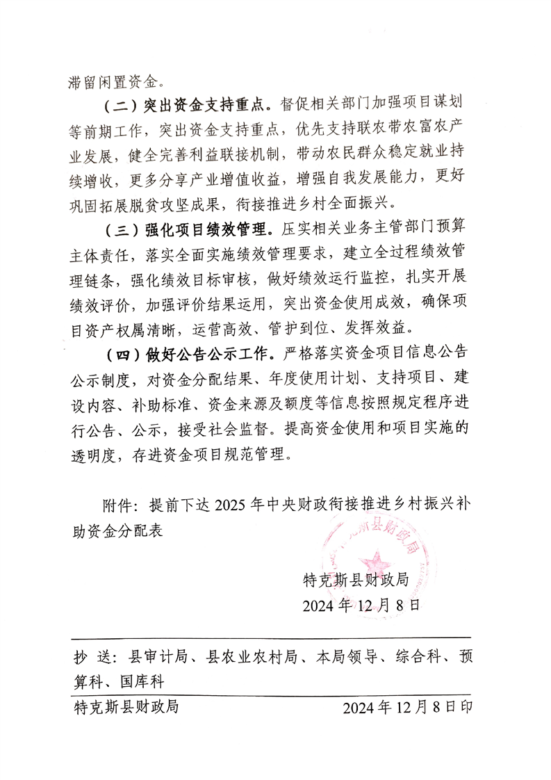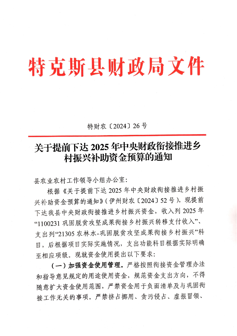 特财农[2024]26号:关于提前下达2025年中央财政衔接推进乡村振兴补助资金预算的通知10167万元