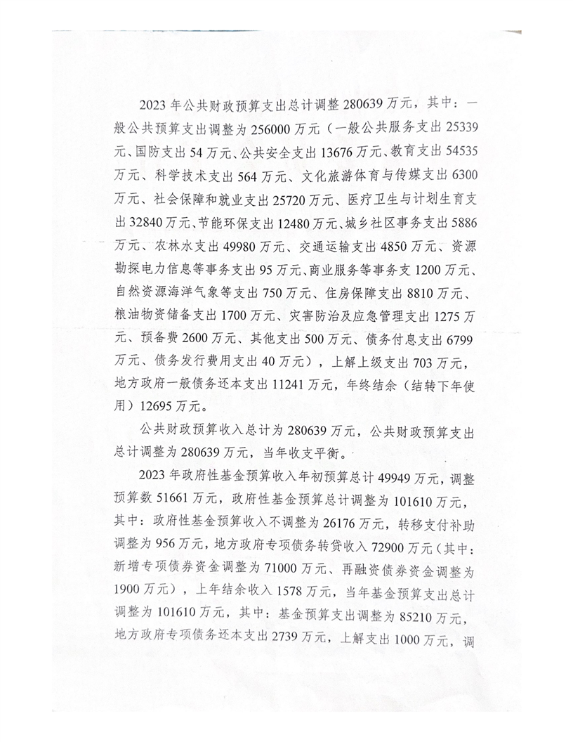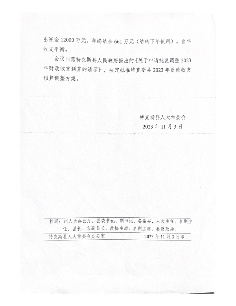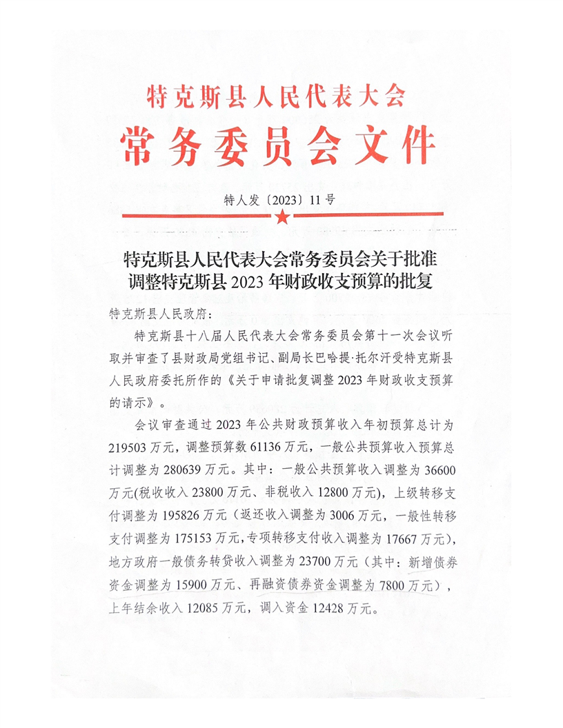 特克斯县人民代表大会常务委员会关于批准调整特克斯县2023年财政收支预算的批复(特人发【2023】11号)