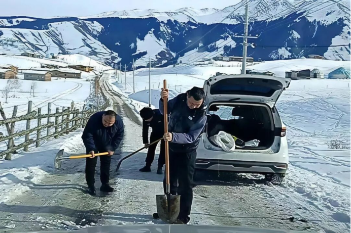 特克斯镇霍斯库勒村组织党员干部成立志愿服务队,开展道路铲冰除雪行动,及时消除安全隐患,确保群众出行安全。(县委统战部、县工商联、侨联驻特克斯镇霍斯库勒村工作队 陈佳)