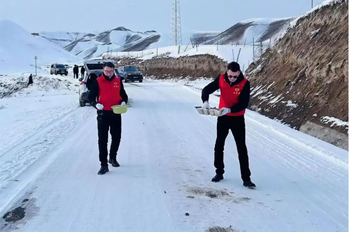 乔拉克铁热克镇克孜勒阔拉村组织工作队员对结冰路段撒布融雪剂,有效加快积雪融化速度,防止路面二次结冰,以实际行动保障了村民出行安全。(县发改委、统计局、商工局驻乔拉克铁热克镇克孜勒阔拉村工作队 赵辉)
