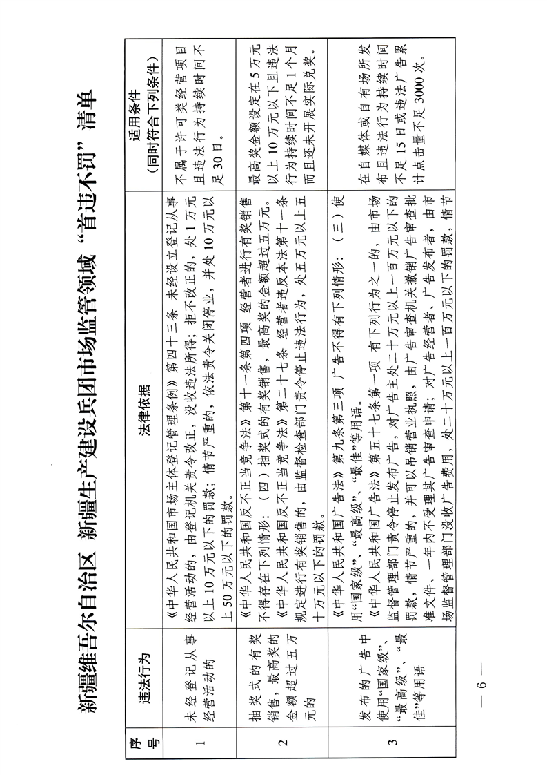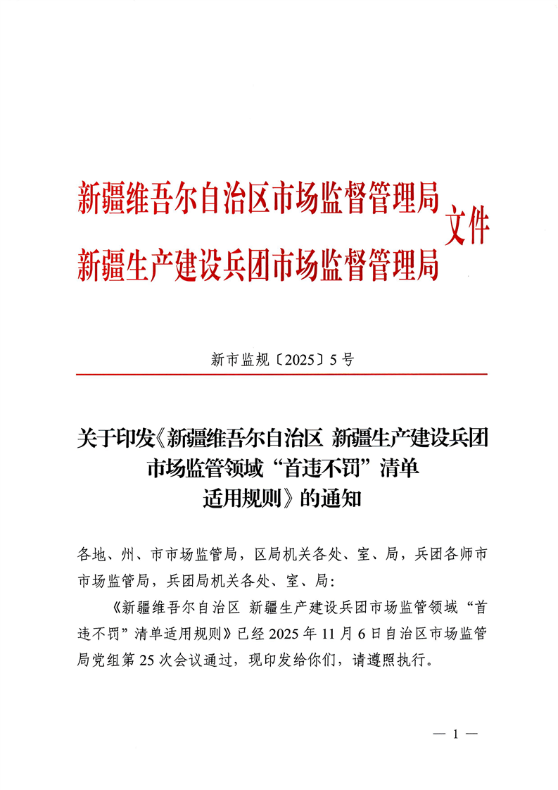 关于印发《新疆维吾尔自治区 新疆生产建设兵团市场监管领域“首违不罚”清单适用规则》的通知