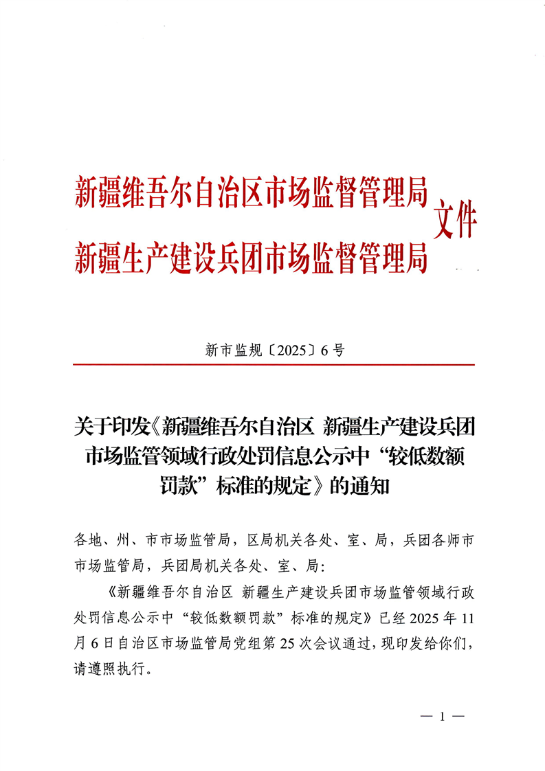 关于印发《新疆维吾尔自治区 新疆生产建设兵团市场监管领域行政处罚信息公开中“较低数额罚款”标准的规定》的通知