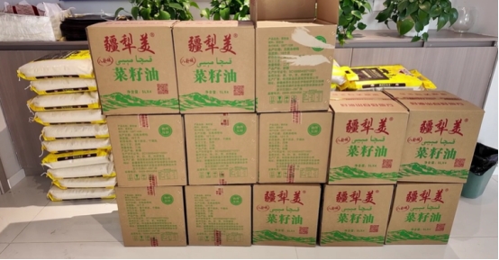 △工作人员为环卫工人逐一发放大米、面粉、食用油等生活物资 侯湘菱摄