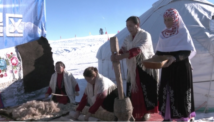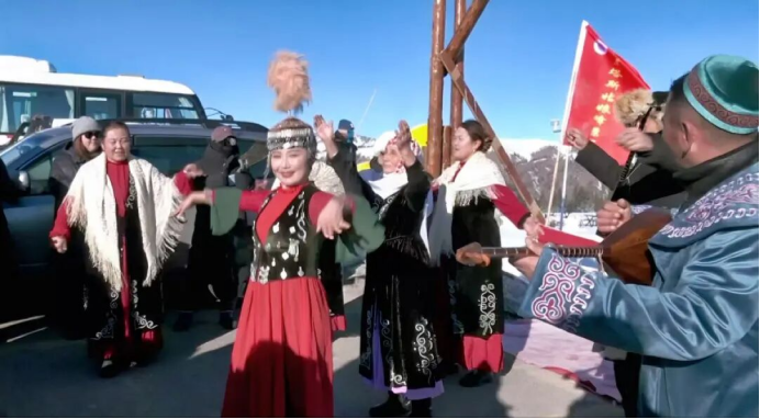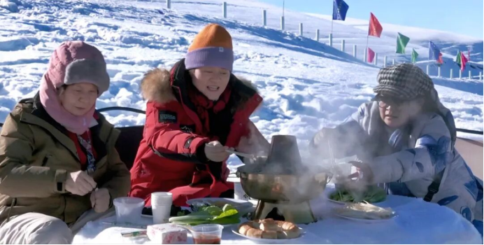 为让远方来客感受草原的热忱,阿克塔斯姑娘峰景区工作人员早早便在入口等候,以当地最具特色的礼仪迎接摄影团成员。欢快的歌曲伴随着“恰秀”撒糖的美好祝福,摄影团成员们瞬间融入欢快的氛围。随后,景区还安排了刺绣、打羊毛、擀毡子、捣麦子、制作塔巴馕等传统民俗展示依次登场,原汁原味的牧民生活场景鲜活生动,成为镜头下最珍贵的素材。摄影爱好者们或驻足围观、或轻声交流,纷纷举起相机抓拍每一个精彩瞬间。采风间隙,热气腾腾的雪地火锅暖心开席,鲜香的食材在锅中翻滚,让大家在冰天雪地的严寒中,切实感受到了特克斯人的淳朴热情与满满暖意。