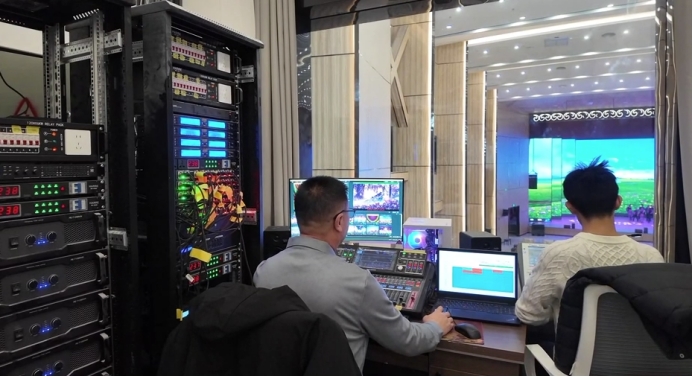 特克斯县演艺大厅剧场灯光音响师傅谢旭林说:“为保障特克斯演艺大厅首场大型演出及首届春晚顺利举办,我们正加班加点开展灯光、音响设备的测试与调试工作。”