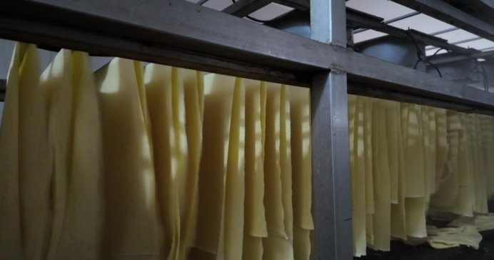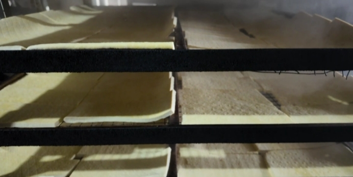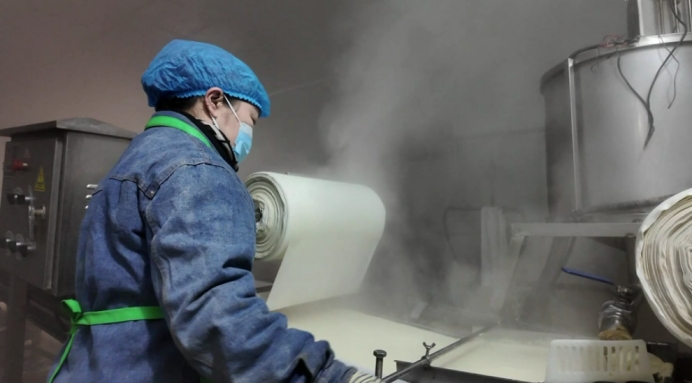 2月22日,在特克斯县易鑫豆制品食品有限责任公司生产车间内,机器轰鸣、一派繁忙,全体员工精神饱满、各司其职,全身心投入到繁忙的生产工作之中。乳色的豆浆在管道中有序流动,经过层层压制、精细加工等多道工序,一张张色泽金黄的豆腐皮和一块块鲜嫩的豆腐便新鲜出炉,带着豆香的清甜弥漫车间,被工人有序分拣、封装,整装待发运往各地市场,将这份烟火暖意送到千家万户。
