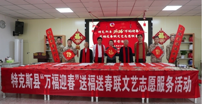 新春将至,暖意先行。2月11日,特克斯县人民武装部营区内暖意融融、温情涌动。由县退役军人事务局牵头,县人民武装部、县文学艺术界联合会协同开展的2026“万福迎春”送福送春联文艺志愿服务进军营活动顺利举行,为坚守岗位、守护一方的官兵们送去新春的诚挚祝福与深切关怀。