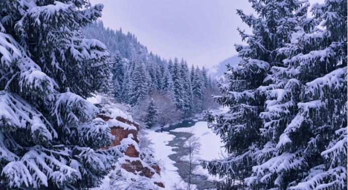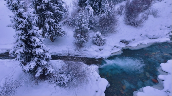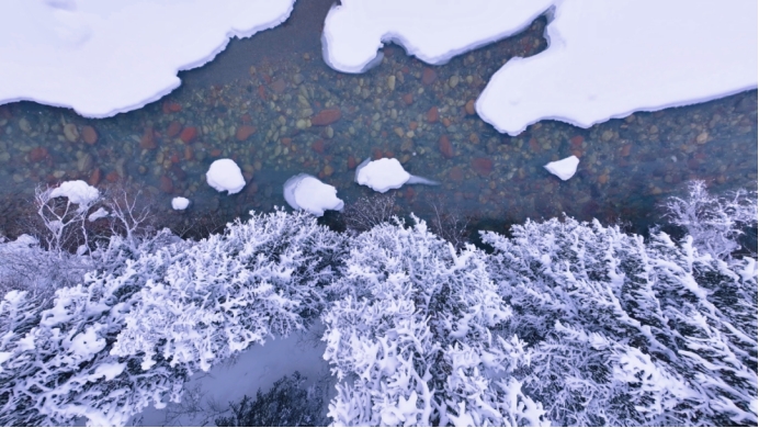 冰河未被严冰封冻,清泉依旧在白雪之间叮咚流淌,澄澈,河水映着岸边的雪色与松影,绘就一幅清冷又治愈的冬日画卷。