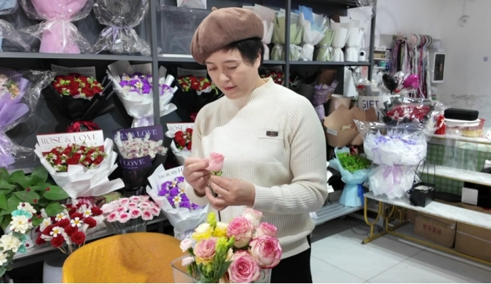 秉持“用心做好每一束花,用心服务每一位顾客”的初心,马红梅搭配的花束精巧别致,总能用一束鲜花,替顾客传递心意、点亮日常。顾客热斯古丽·托胡达洪每逢母亲节、亲友生日都会在马红梅家花店订花,“花好看,老板态度好,价格也合理,特别让人放心。”