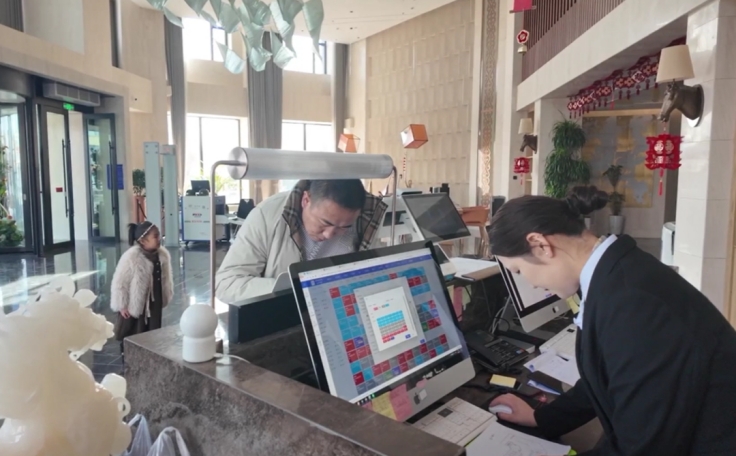 2月3日,位于特克斯八卦城二环的美豪丽致酒店,前台工作人员正为疆内外游客介绍房型、价格,有序办理入住手续。室内装饰巧妙融入本地民风民俗图案及文化元素,让游客沉浸式感受特克斯浓郁的本土文化魅力。