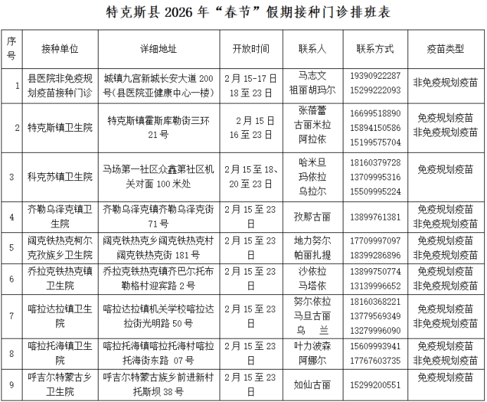 2026年2月15日至2月23日期间,每日上午10:00-14:00,下午15:30-19:00提供接种服务。