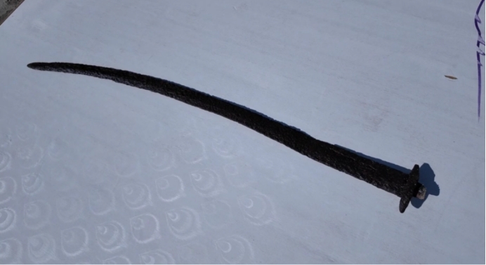 特克斯县乔拉克铁热克镇克孜勒阔拉村村民都拉提·波坦说:“我当时在山上放羊时发现了这把刀,带回家后发现刀身已生锈,疑似文物,便第一时间联系村委会,将刀交给了工作人员。”
