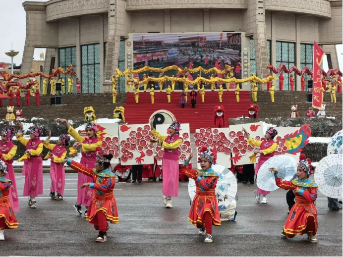 当日12时,活动在号角与鼓声中拉开帷幕,八条街道同步鸣鼓,21名旗手持八卦元素旗帜绕行,龙狮队伍登场点燃现场氛围。开篇展演亮点频现,马年吉祥布偶队传递新春祝福,教育系统非遗代表队现场展示扎染、戏曲、剪纸等传统技艺,彰显文化自信与育人初心;由党政代表、道德模范、乡村振兴先进典型等组成的 “同心奋进方阵”,充分展现特克斯各族各界群众昂扬向上的精神风貌。