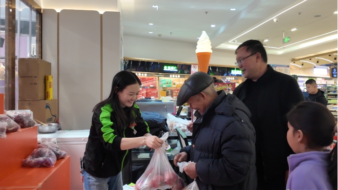 超市购物区内,各类民生商品琳琅满目,米面粮油、生鲜果蔬、日用百货等货品齐全、备货充足。居民们推着购物车有序选购,结账后凭购物小票,即可到爱心发放点免费领取洋葱。