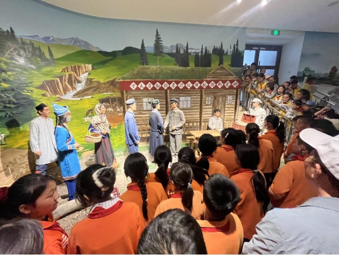 在特克斯迁城主题展区,同学们驻足于复原的劳作场景前,深刻体会到先辈们开荒拓土、建设家园的艰辛与不易,更读懂了八卦城“天人合一”的建设理念背后,凝聚的劳动智慧与家国情怀。 在红色文化展区,同学们面向鲜红的党旗与入党誓词庄严伫立,认真学习党的光辉历史与特克斯本地的红色故事,在潜移默化中传承红色基因、筑牢理想信念。