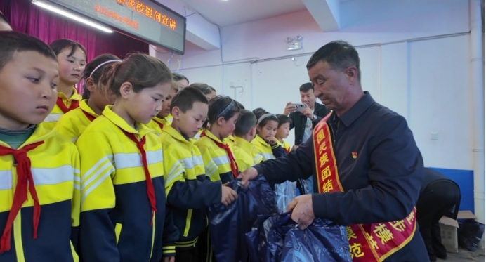 活动现场,全体师生共同观看《行走在天堑危途上的 “健康守护神”》专题视频,直观感受居马泰医生三十余年如一日,扎根偏远牧区,不畏严寒险阻,骑马巡诊、翻越雪山达坂,用脚步丈量牧区大地,以坚守守护各族群众生命健康的感人事迹。居马泰·俄白克为30名牧区学生送去衣物,以实际行动传递温情、凝聚爱心。