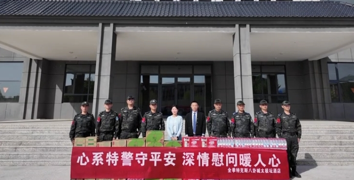 4月28日,特克斯县全季酒店八卦城太极坛店带着饮料、方便面等慰问物资,走进县公安局特警大队,看望慰问坚守执勤一线的特警队员,为日夜守护平安的民辅警送上暖心关怀。