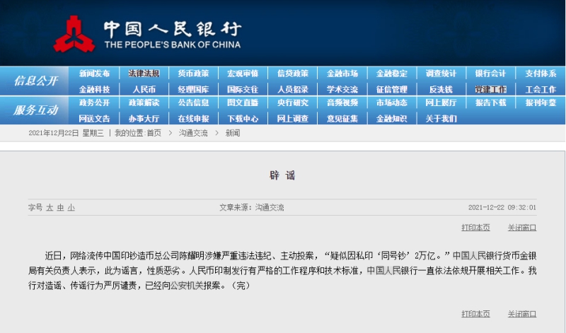 人民网北京12月22日电 (记者罗知之)据人民银行官网消息,近日,网络流传中国印钞造币总公司陈耀明涉嫌严重违法违纪、主动投案,“疑似因私印‘同号钞’2万亿。”人民银行货币金银局有关负责人表示,此为谣言,性质恶劣。