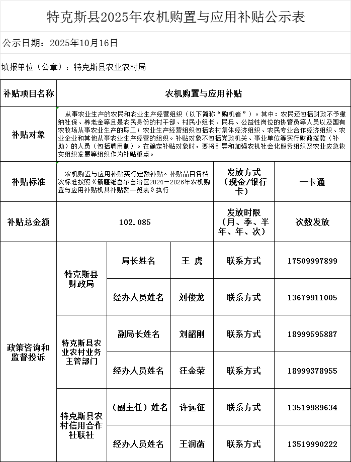 特克斯县2025年度草原生态奖补资金发放汇总表