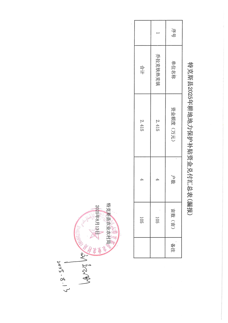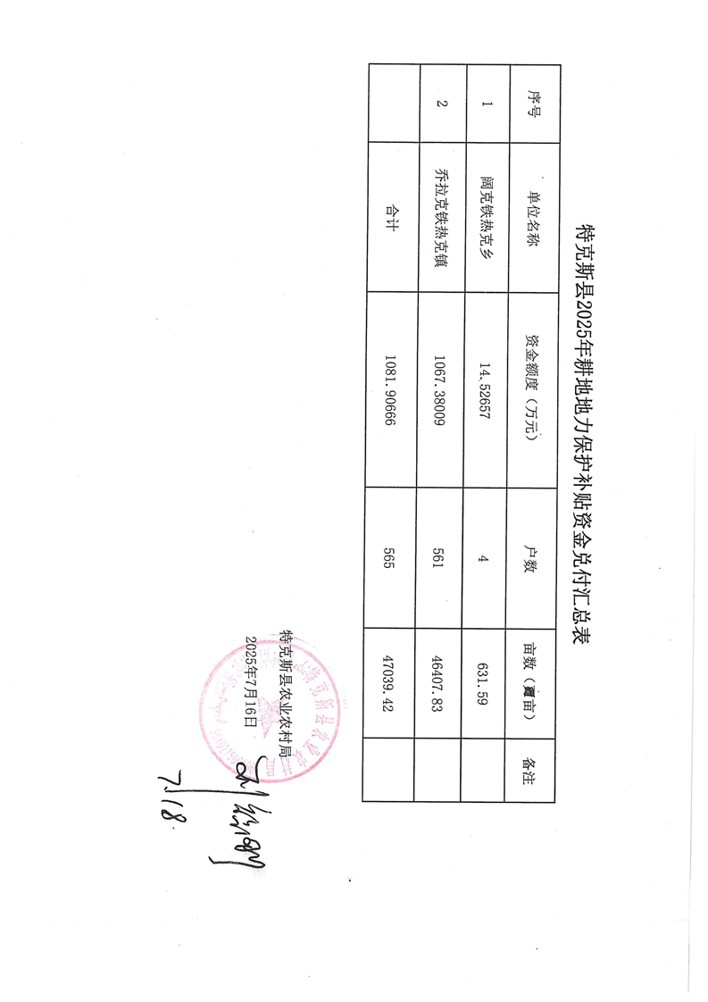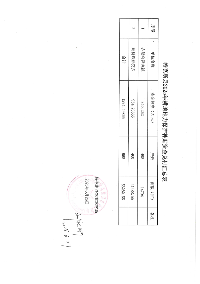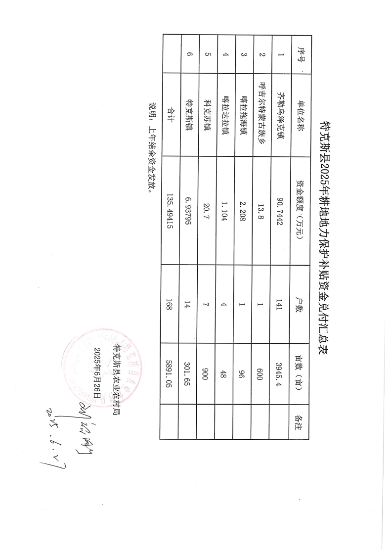 特克斯县2025年耕地力保护补贴资金兑付汇总表