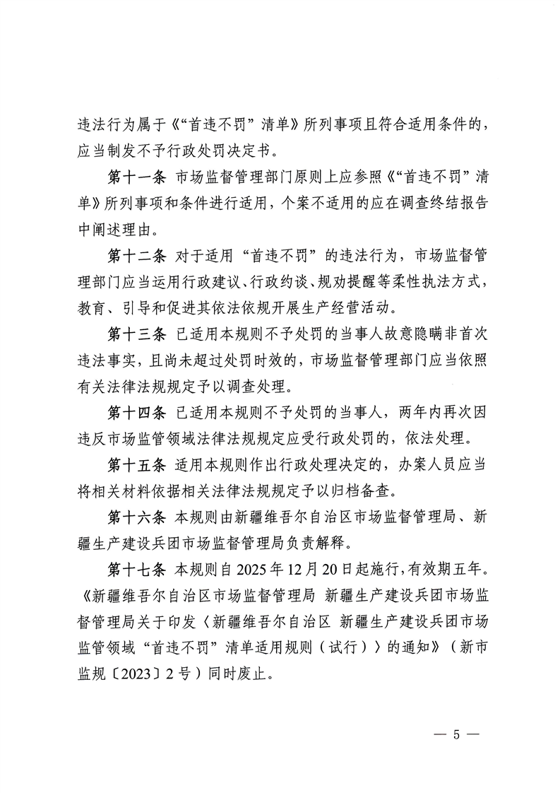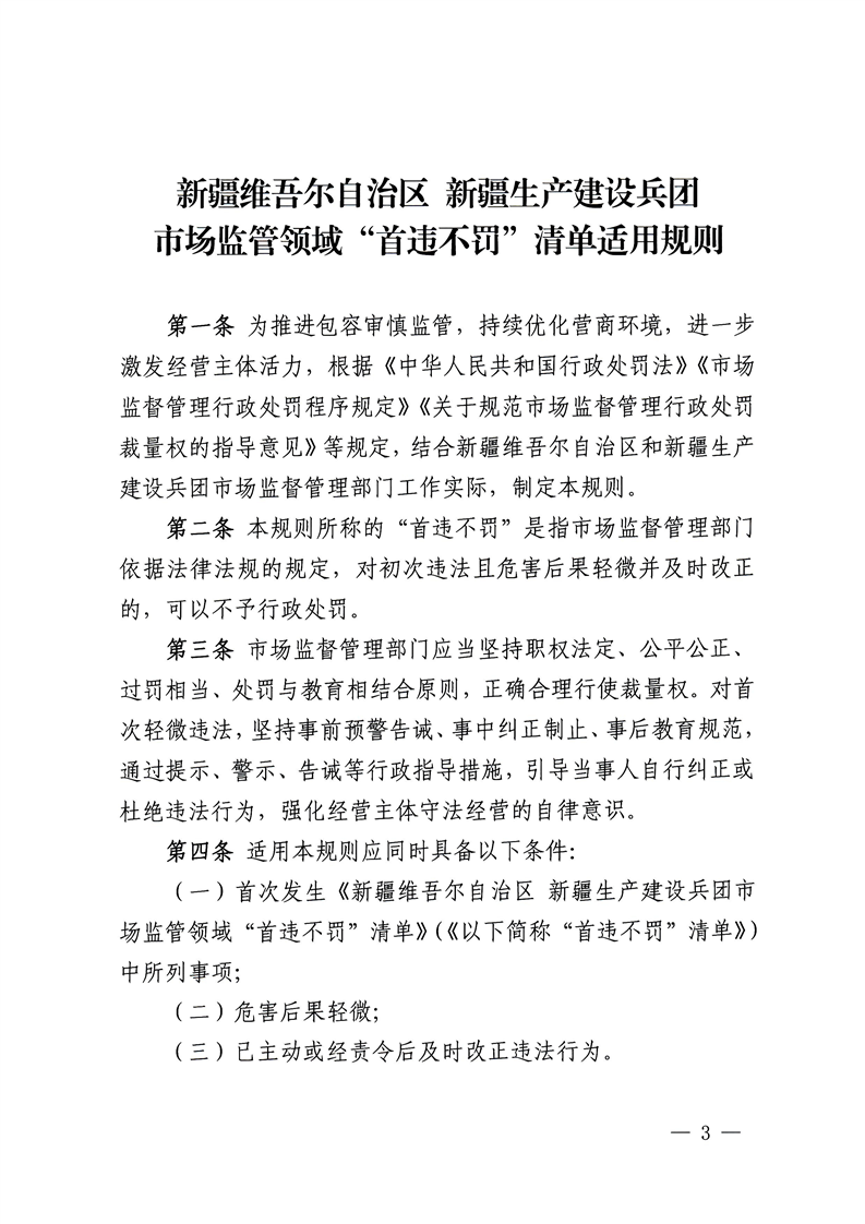 关于印发《新疆维吾尔自治区 新疆生产建设兵团市场监管领域“首违不罚”清单适用规则》的通知