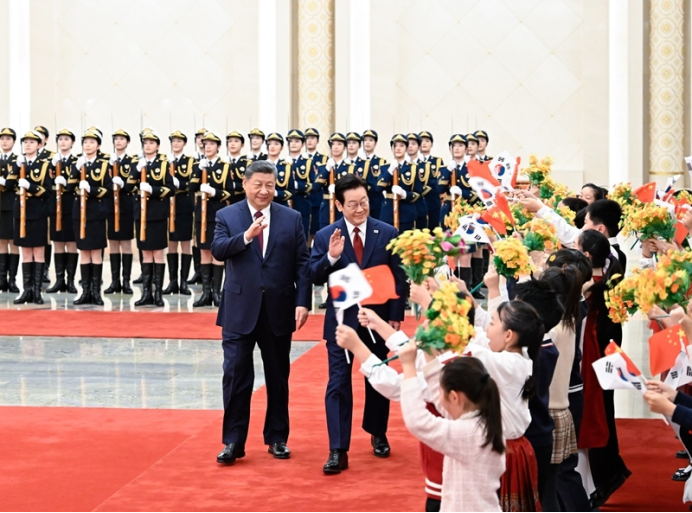 1月5日下午,国家主席习近平在北京人民大会堂同来华进行国事访问的韩国总统李在明举行会谈。这是会谈前,习近平在人民大会堂北大厅为李在明举行欢迎仪式。新华社记者 申宏 摄