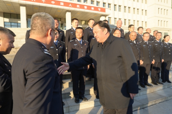 在伊犁州公安局,州党委副书记、州长叶尔夏提·吐尔逊拜向民警代表致以节日问候。李亚锋 摄