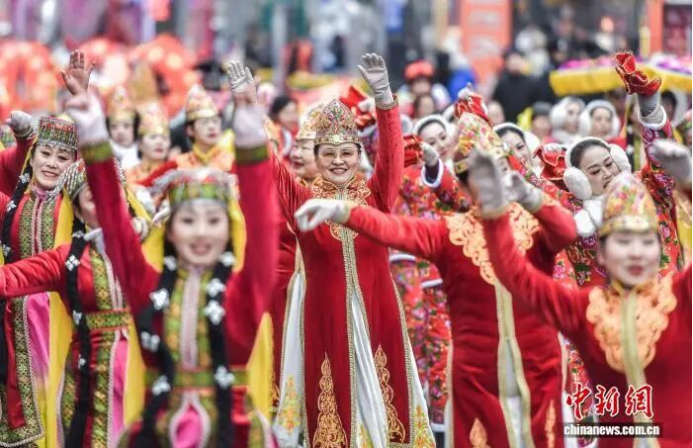 2月5日,新疆乌鲁木齐市闹市区西门老街锣鼓喧天,一场社火展演游街活动在此举行,吸引众多过往市民驻足观看。刘新摄