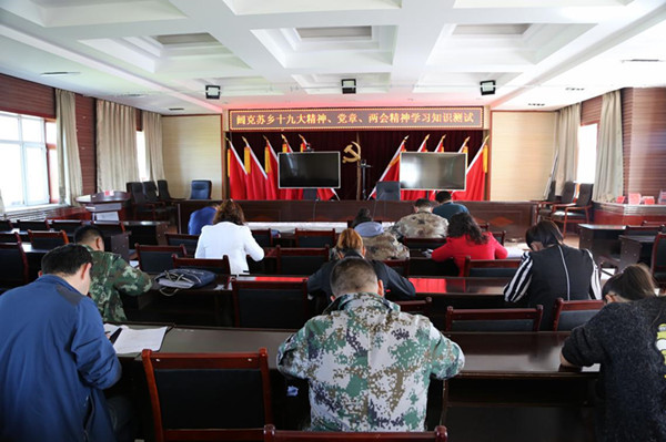 2018年5月3日,阔克苏乡在积极开展学习十九大、党章、两会精神的基础上,组织全乡领导干部进行了应知应会知识测试,检验领导干部对十九大、党章、两会精神的学习领悟情况。