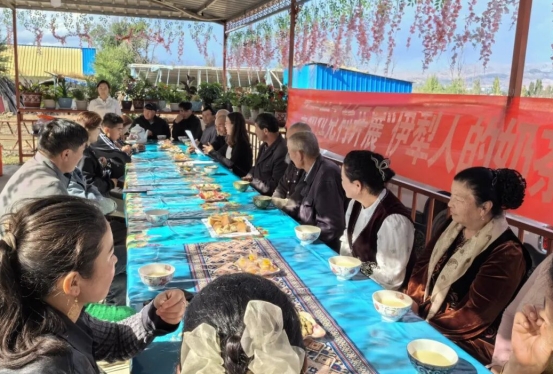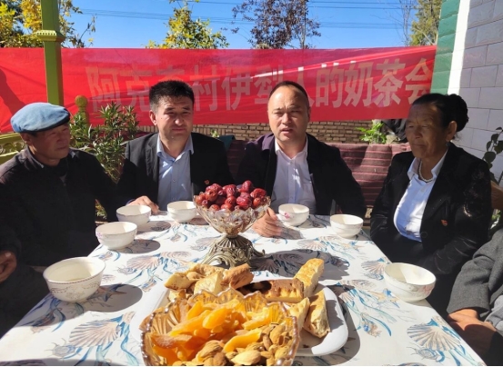 在乔拉克铁热克镇孟布拉克村的村民家院中,彩饰缤纷的花卉挂饰随风轻摇,村民们围坐在摆满奶茶、馕饼和瓜子的桌旁,一场别开生面的“伊犁人的奶茶会”正热烈开展。村“两委”与工作队组织群众齐聚于此,以茶为媒,一同学习铸牢中华民族共同体意识重要内容,围绕环境卫生整治议题畅所欲言,为乡村发展凝聚共识。