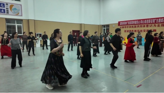 △特克斯镇霍斯库勒村文化大礼堂里,40 余名舞蹈爱好者正随着节奏起舞 居哈尔毕 侯湘菱 摄
