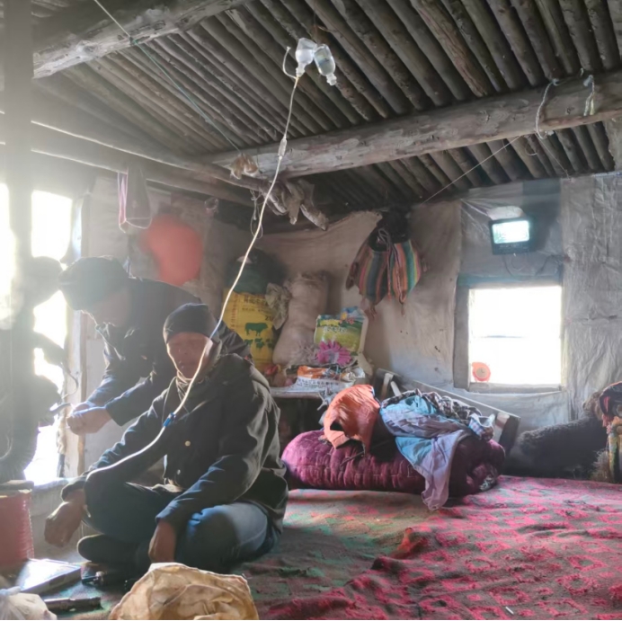 冬季牧区感冒多发,巡诊队伍几乎挨家挨户为牧民量血压、测体温,将感冒药送到牧民手中,牧民们的脸上都洋溢着笑容。同时,他们还为心脏病、高血压等慢病患者送去了对症药物。完成20户牧民的巡诊工作时,正值2026年新年第一天,巡诊队在风雪路上度过了这个特殊的新年。