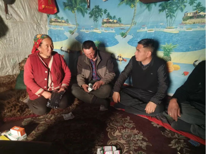 杰恩斯克力德・哈依尔德恩拜牙疼已十天,正准备下山就诊,听到巡诊队要来,早早等候,村医赛山尔力・沙海为他打针、送药,第二天他肿起的半边脸就消退,牙疼症状明显改善。他开心地说:“终于不用下山了!”一直担心下山后无人放羊的顾虑也彻底消除,村医叮嘱他按时服药并告知相关注意事项。