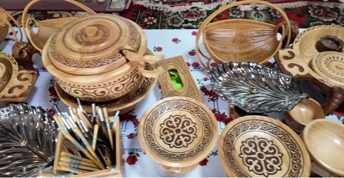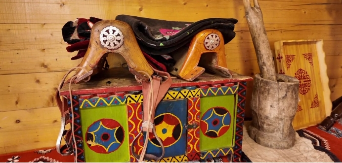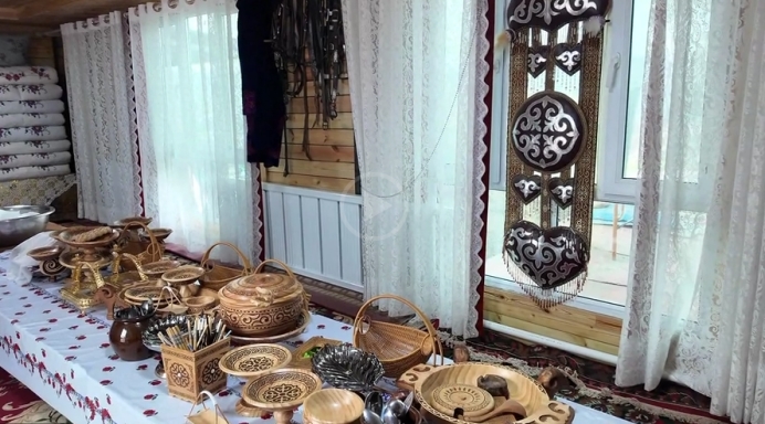 4月7日上午,记者跟房雪宁一起走进喀拉达拉镇喀拉峻村村民昂抄尔别克·赛尔山别克家的家访点,浓郁的民俗气息扑面而来。整洁木制房屋装饰,墙上挂着各式马具、手工制品,桌上摆放特色美食。昂抄尔别克·赛尔山别克指着墙上陈列的老物件,笑着介绍:“这一排都是有50年历史的马具,这个是马笼头,是我们抓马、骑马的时候必需品。这个小马鞍子,是我爷爷小时候骑过的,至今已经有80年了,我打算以后传给我儿子。你们看这件手工外套,是我奶奶做的羊皮大衣,大概有五公斤重,但是特别暖和。”