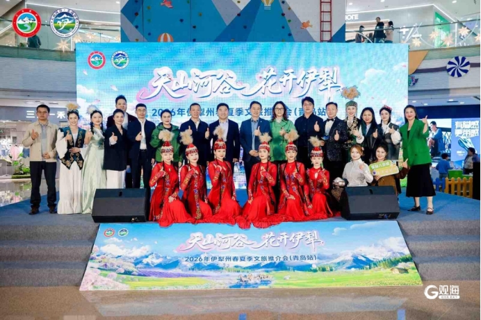 当大西洋的暖湿气流最终驻足于天山脚下,伊犁河谷便成为“塞外江南”;当黄海之滨的浪花轻拂着红瓦绿树,青岛正舒展着“帆船之都”的浪漫。4月3日,由江苏省对口支援新疆伊犁州前方指挥部主办、伊犁州文化广播电视和旅游局承办的“天山河谷·花开伊犁”2026年伊犁春夏季文旅推介会在青岛举行。这场跨越4000多公里的“山海对话”,通过一场别开生面的资源展示与深度文旅交流,让东部海滨的青岛与西部边陲的伊犁找到了共鸣。