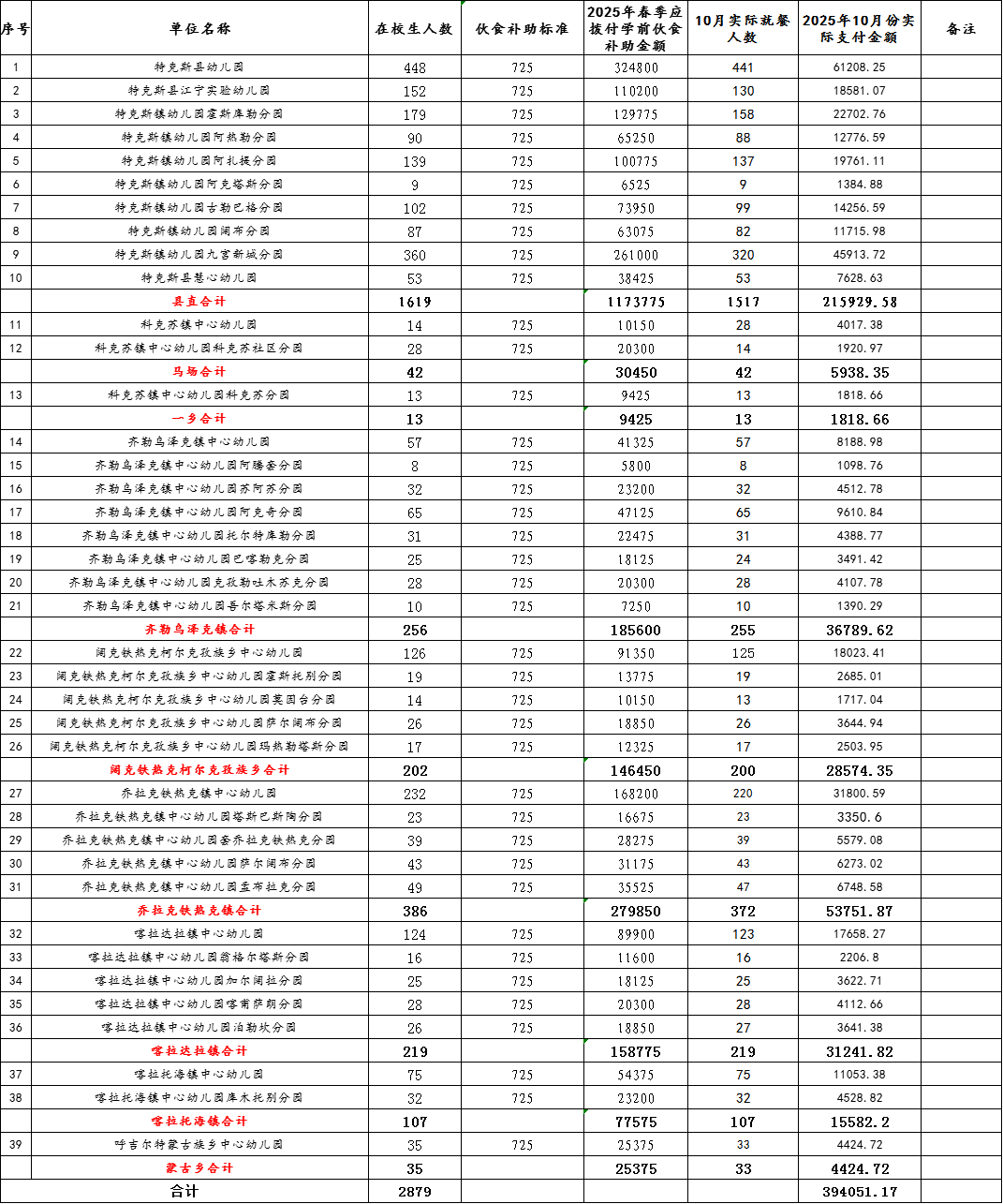 特克斯县学前教育2025年10月份伙食费款统计表(公示)